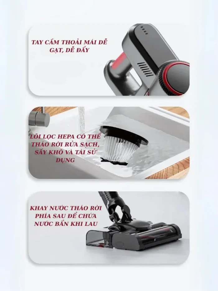 - Có khay nước để có thể vừa hút bụi và vừa lau nhà tiện lợi